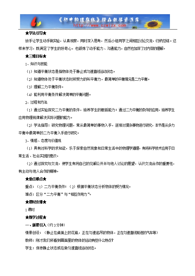 2.这一节内容是对牛顿第一定律进一步的诠释(不受力和受平衡力),也为后面学习摩擦力、压强和浮力奠定了重要的基础,二力平衡或说力的平衡是分析力学问题不可缺少的理论和方法,所以本节课是整个九年级的重点。