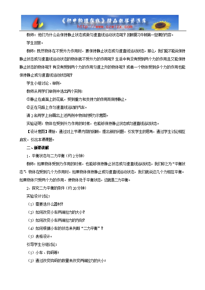 本课注重生活实际,是“牛顿第一定律”的深入,同时较好的渗透了“力与运动”的关系。通过复习“牛顿第一定律”和“相互作用力”,展示生活现象,再设计实验探究“二力平衡”的条件。这样不但充分体现的物理源于生活而用于生活的特点,而且还能很好吸引住学生的注意力,教学目标也自然能达到了。
