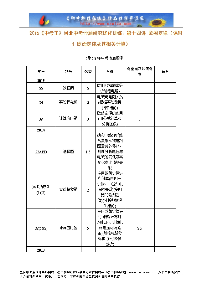 2016《中考王》河北中考命题研究优化训练:第十四讲 欧姆定律(课时1 欧姆定律及其相关计算)