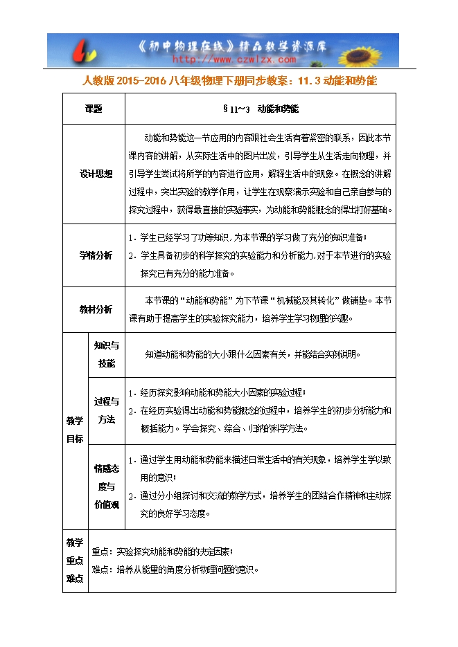 人教版2015-2016八年级物理下册同步教案:11.3动能和势能(附设计思想、学情分析)