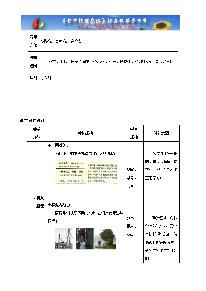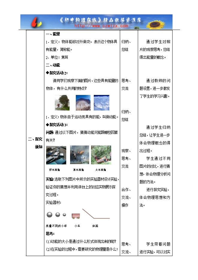 设计思想 动能和势能这一节应用的内容跟社会生活有着紧密的联系,因此本节课内容的讲解,从实际生活中的图片出发,引导学生从生活走向物理,并引导学生尝试将所学的内容进行应用,解释生活中的现象。在概念的讲解过程中,突出实验的教学作用,让学生在观察演示实验和自己亲自参与的探究过程中,获得最直接的实验事实,为动能和势能概念的得出打好基础。