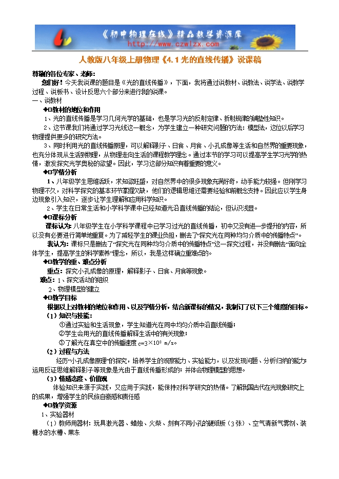 您们好!今天我说课的题目是《光的直线传播》,下面,我将通过说教材、说教法、说学法、说教学过程、说板书、设计反思六个部分来进行我的说课。一、说教材