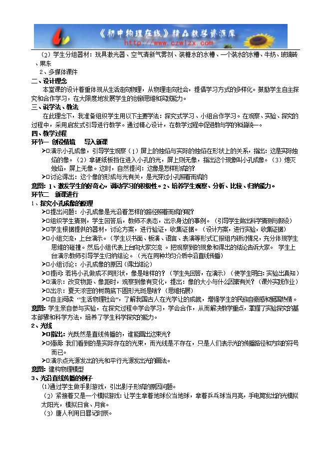2、学生在日常生活和小学科学课中已经知道光沿直线传播的结论,但认识浅显。