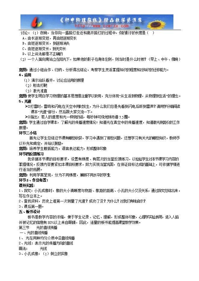 2、这节课我们将通过学习光线这一概念,为学生建立一种研究问题的方法:模型法,这位以后学习物理提供更多的研究方法。