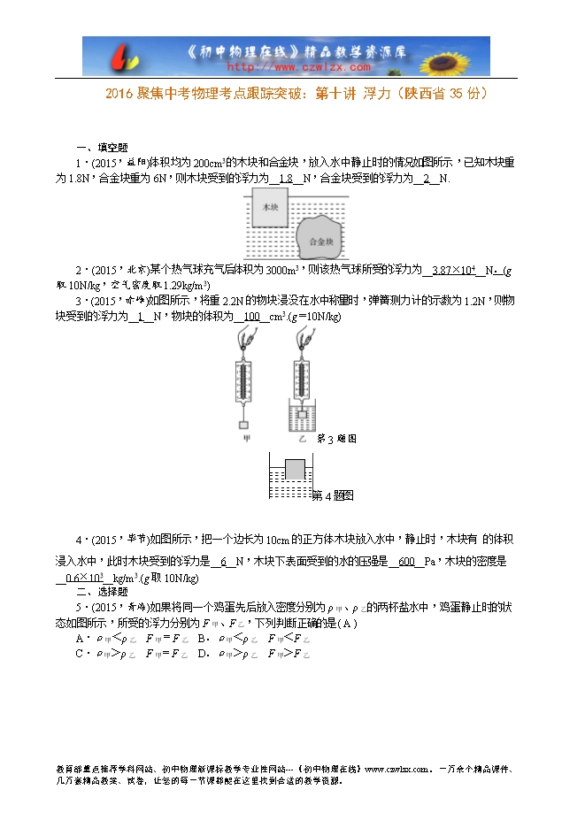 2016聚焦中考物理考点跟踪突破:第十讲 浮力(陕西省35份)