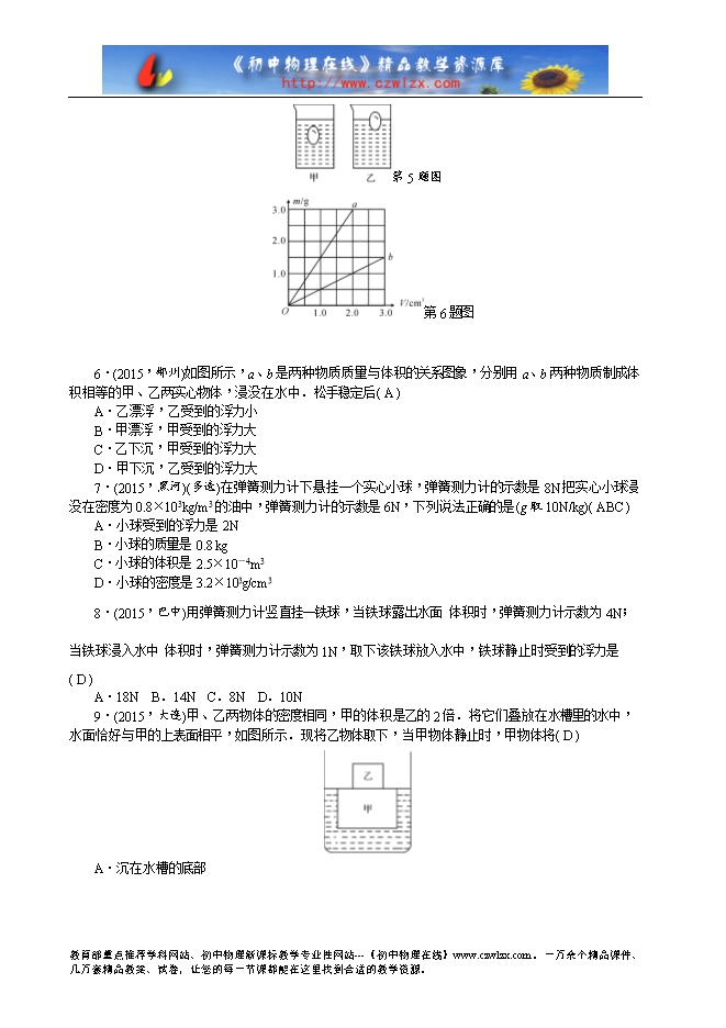 6.(2015,郴州)如图所示,a、b是两种物质质量与体积的关系图象,分别用a、b两种物质制成体积相等的甲、乙两实心物体,浸没在水中.松手稳定后( A )