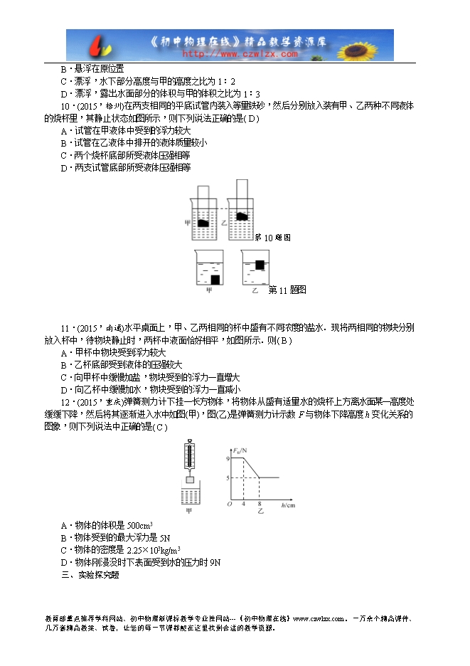 5.(2015,青海)如果将同一个鸡蛋先后放入密度分别为ρ甲、ρ乙的两杯盐水中,鸡蛋静止时的状态如图所示,所受的浮力分别为F甲、F乙,下列判断正确的是( A )
