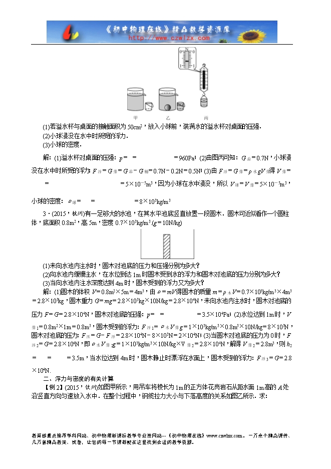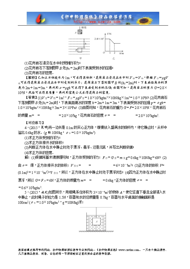 【例1】(2015,衡阳)如图所示,将质量为2kg的正方形物块,放入盛有水的水槽内,待物块静止时,其下表面距水面6cm,求: