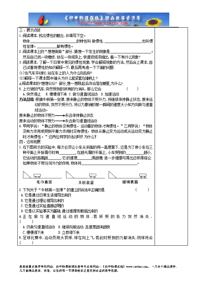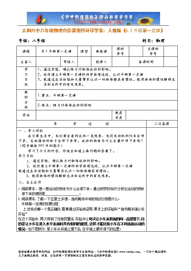 【内容简介】课题 8.1牛顿第一定律 课型 新授课 课时