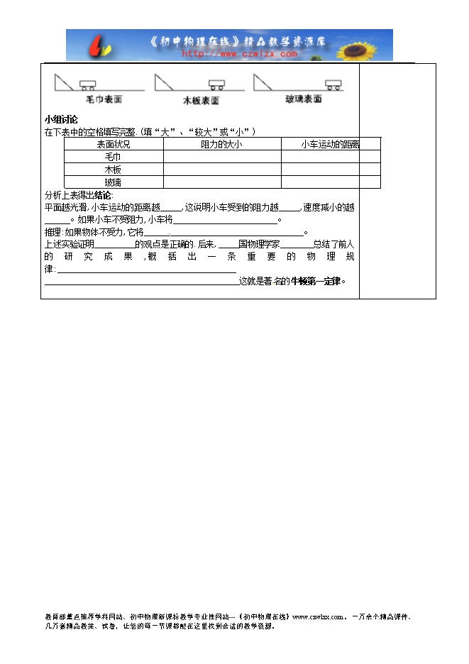 学习目标 1、 通过实验,确认阻力对物体运动的影响。