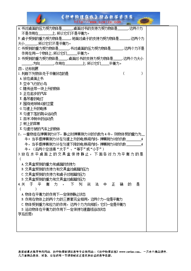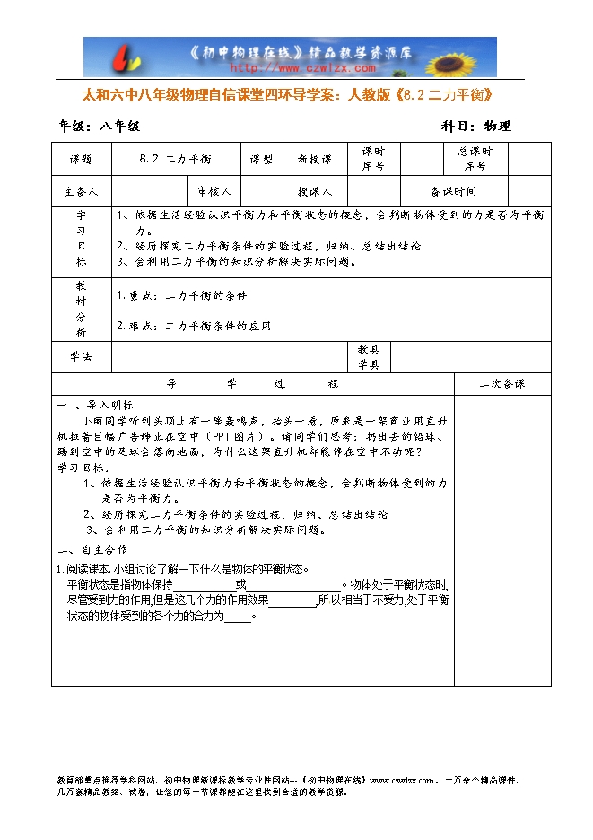 太和六中八年级物理自信课堂四环导学案:人教版《8.2二力平衡》