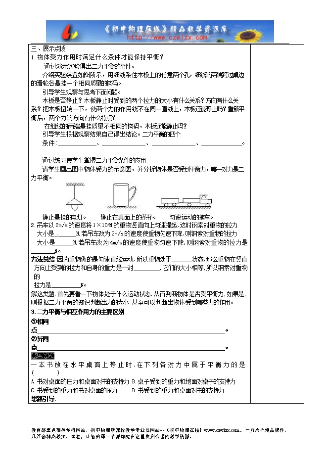 【内容简介】课题 8.2 二力平衡 课型 新授课 课时