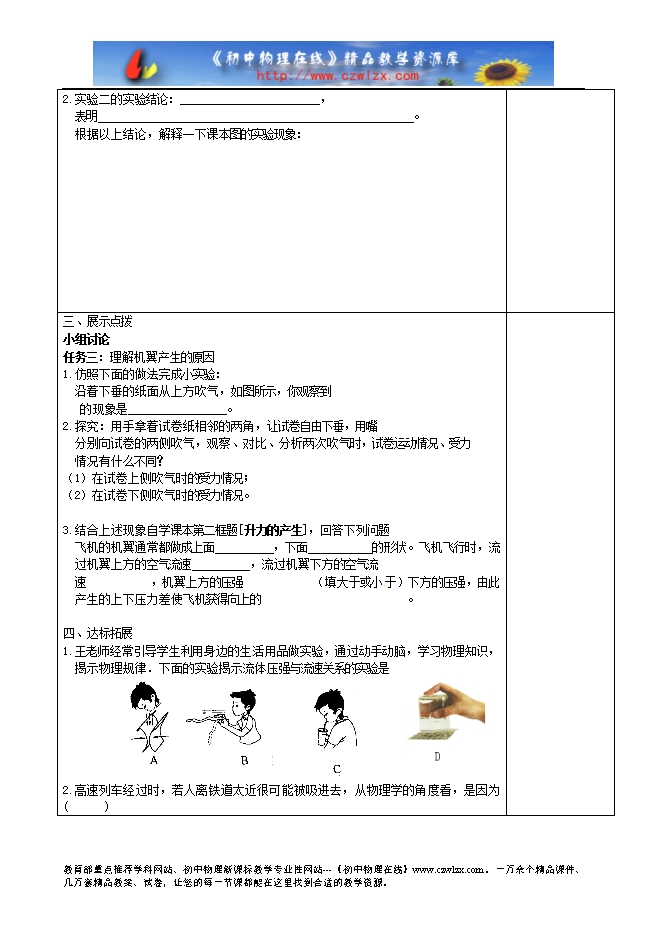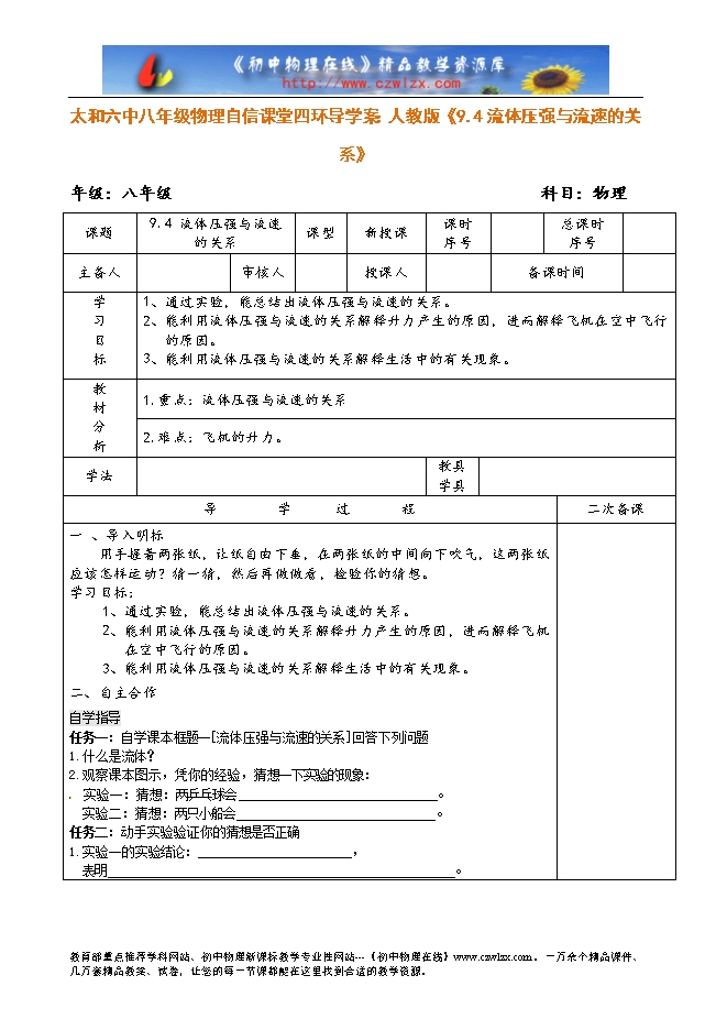 太和六中八年级物理自信课堂四环导学案:人教版《9.4流体压强与流速的关系》