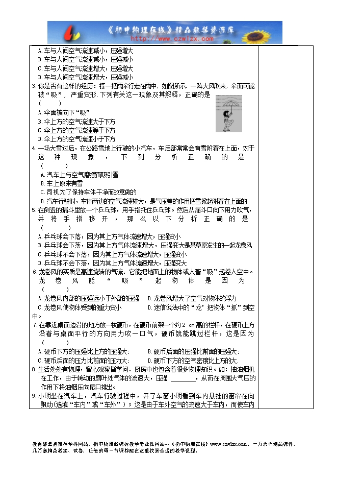 3、 能利用流体压强与流速的关系解释生活中的有关现象。