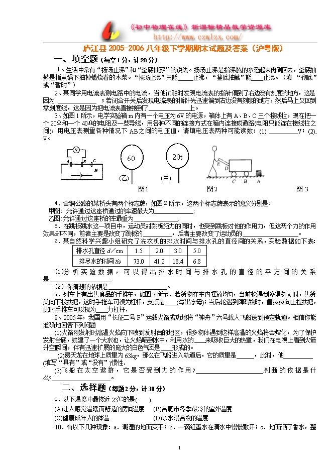 庐江县2005-2006八年级下学期期末试题及答案(沪粤版)