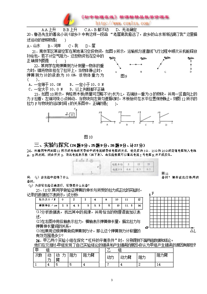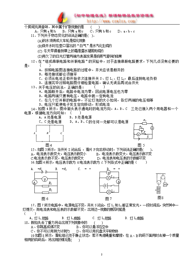 【内容简介】一、填空题(每空1分,计20分) 1、生活中常有“扬汤止沸”和“釜底抽薪”的说法。扬汤止沸是指沸腾的水滔起来再倒回去,釜底抽薪是指从锅下抽掉燃烧着的木柴。“扬汤止沸”只能 止沸,“釜底抽薪”能 止沸。(填 “彻底”或“暂时”) 2、某同学用电流表测电路中的电流,当他试触时发现电流表的指针偏到了右边没有刻度的地方,这是因为 ;若闭合开关后发现电流表的指针先迅速偏到右边没有刻度的地方,然后马上又回到零刻度线,这是因为把电流表直接接到了 上。 3、如图1所示,电学实验箱m内有一个电压为6V的电源,箱体上有A、B、C三个接线柱,现在把一个20Ω和一个40Ω的电阻及一些导线,用各种不同的连接方式在箱内连接成通路(电阻只能连在接线柱之间),用电压表测量各种情况下AB之间的电压值,请填电压表两种可能读数:(1) V;(2) V。 ..........