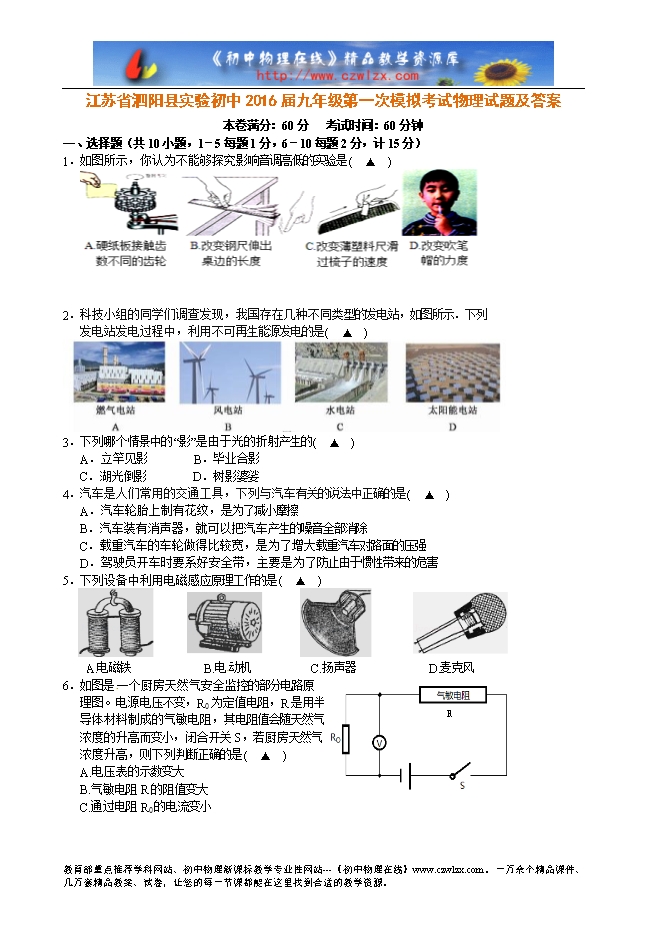 江苏省泗阳县实验初中2016届九年级第一次模拟考试物理试题及答案