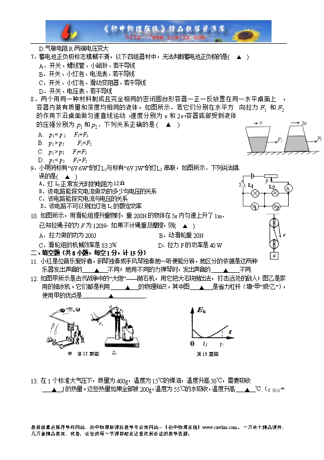 8.两个用同一种材料制成且完全相同的密闭圆台形容器一正一反放置在同一水平桌面上, 容器内装有质量和深度均相同的液体,如图所示.若它们分别在水平方向拉力F1 和F2的作用下沿桌面做匀速直线运动,速度分别为v和2v,容器底部受到液体的压强分别为p1和p2.下列关系正确的是( ▲ )