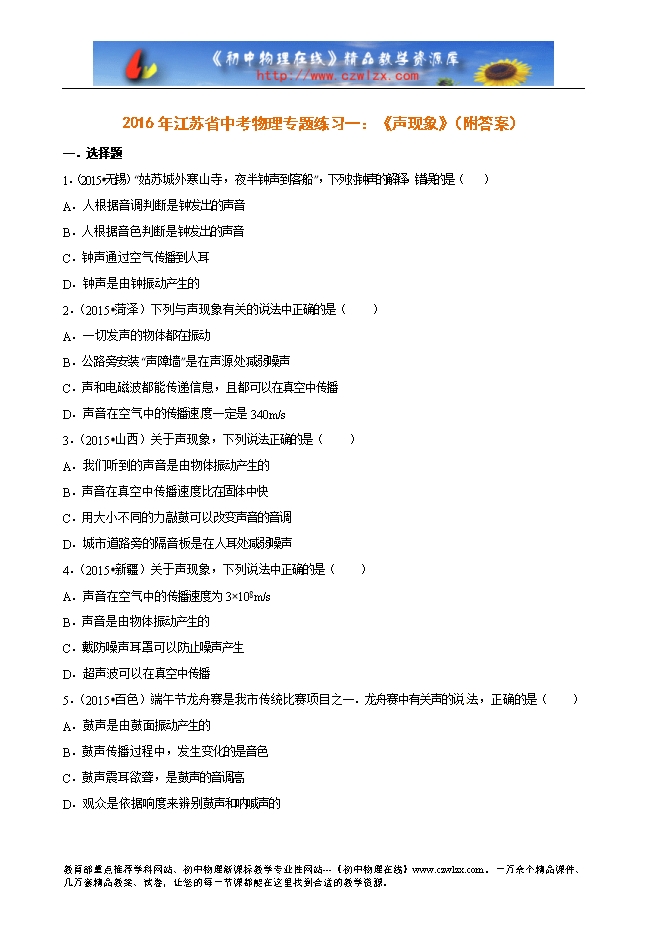 1.(2015?无锡)“姑苏城外寒山寺,夜半钟声到客船”,下列对钟声的解释,错误的是( )