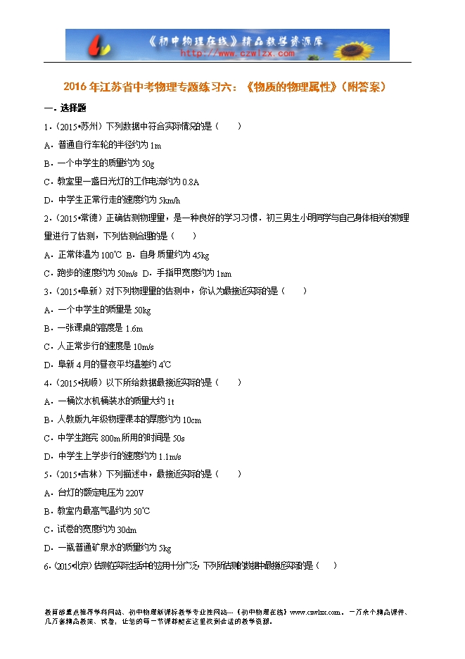 2016年江苏省中考物理专题练习六:《物质的物理属性》(附答案)