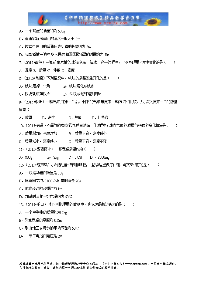 7.(2015?百色)一瓶矿泉水放入冰箱冷冻,结冰.这一过程中,下列物理量不发生变化的是( )