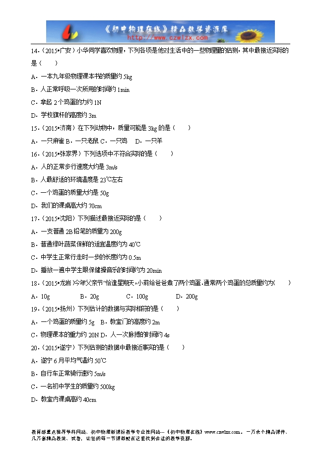 1.(2015?苏州)下列数据中符合实际情况的是( )
