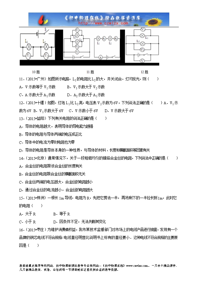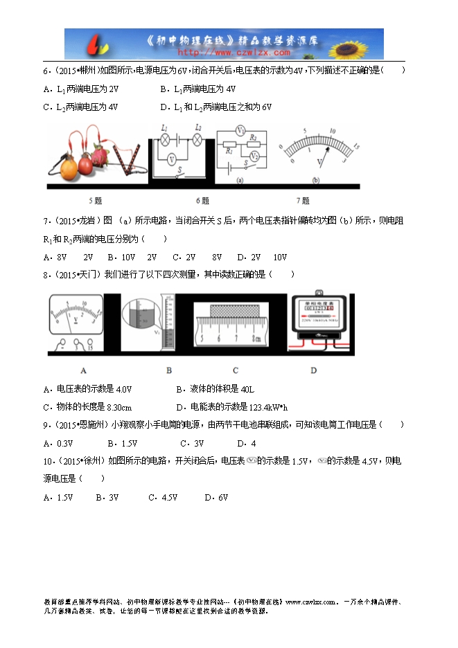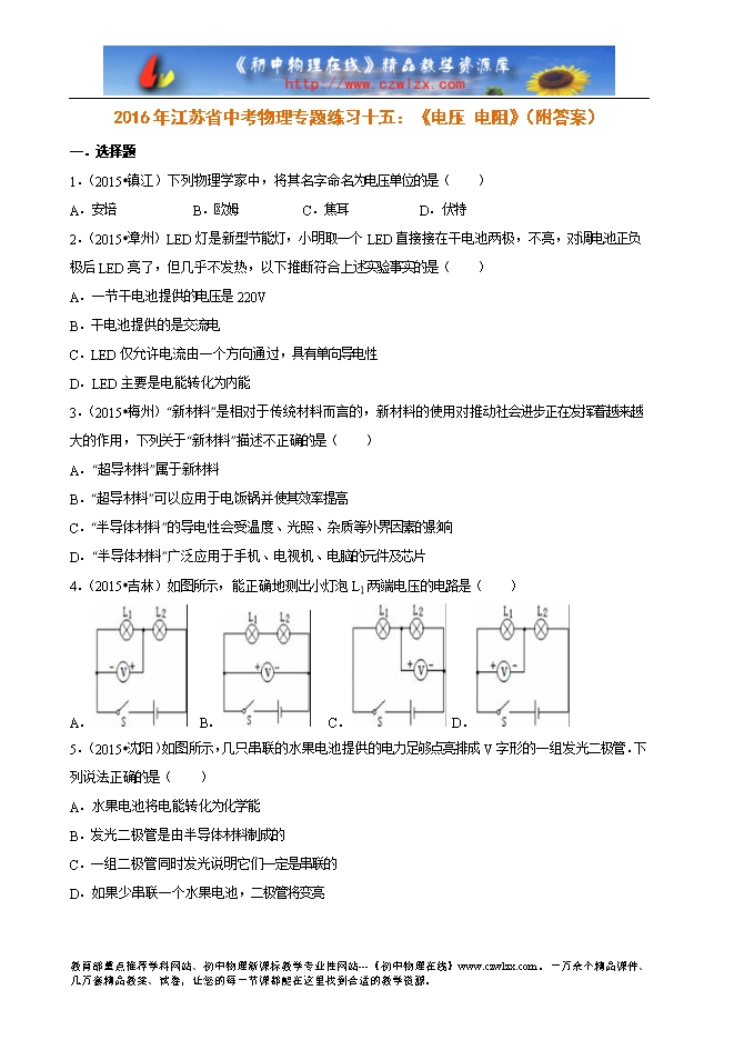 2016年江苏省中考物理专题练习十五:《电压 电阻》(附答案)