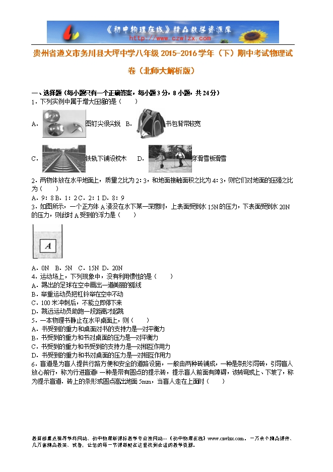 贵州省遵义市务川县大坪中学八年级2015-2016学年(下)期中考试物理试卷(北师大解析版)