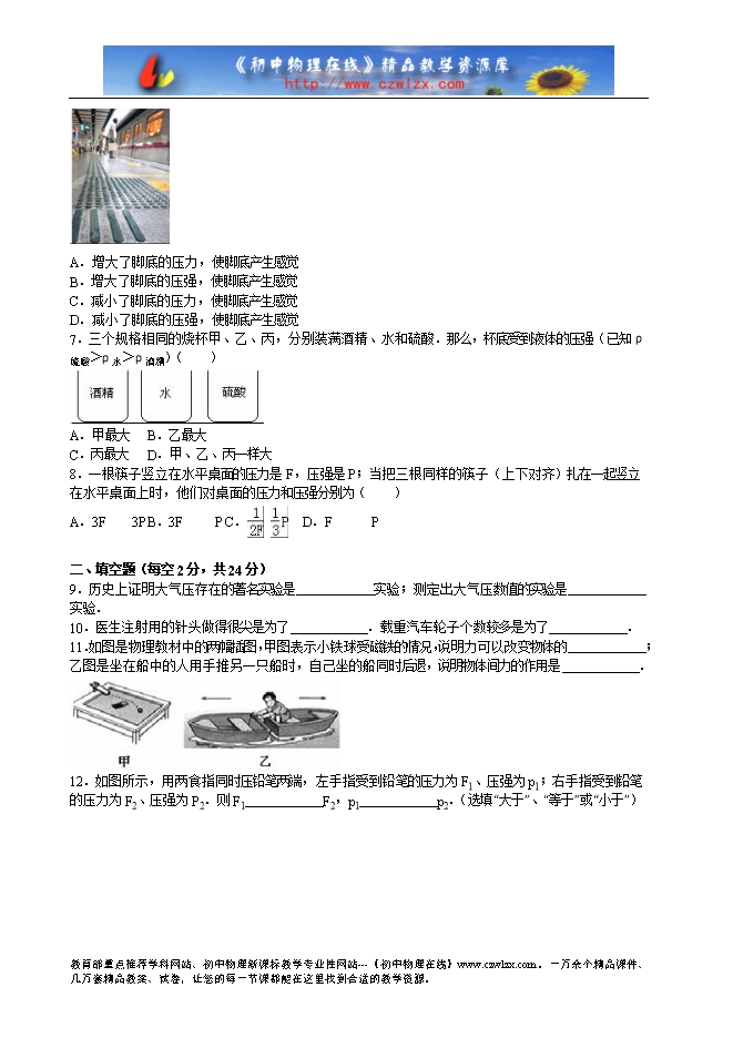 2.两物体放在水平地面上,质量之比为2:3,和地面接触面积之比为4:3,则它们对地面的压强之比为( )