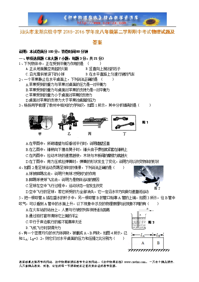 山东省新泰市龙廷镇中心学校2015-2016学年八年级下学期物理期中模拟试题及答案