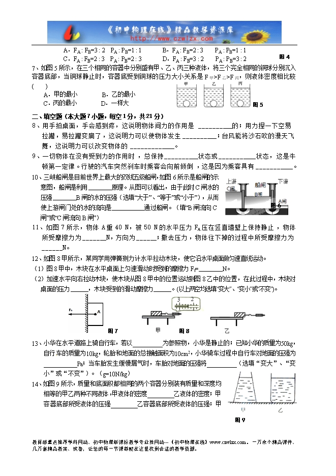 6、有一个密度均匀的长方体铜块,被截成A、B两块,如图4所示,已知LA : LB=3 : 2,则它们对水平桌面的压力和压强之比分别为( )