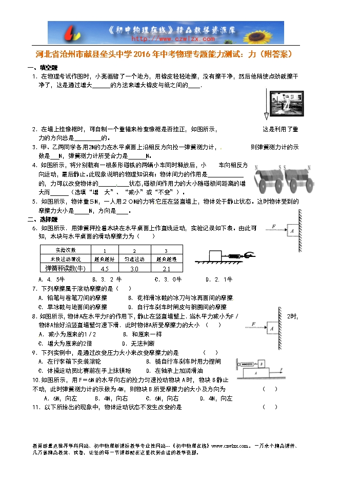 河北省沧州市献县垒头中学2016年中考物理专题能力测试:力(附答案)