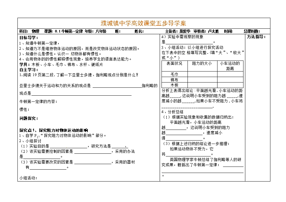 1、自学P17“探究阻力对物体运动的影响”部分。
