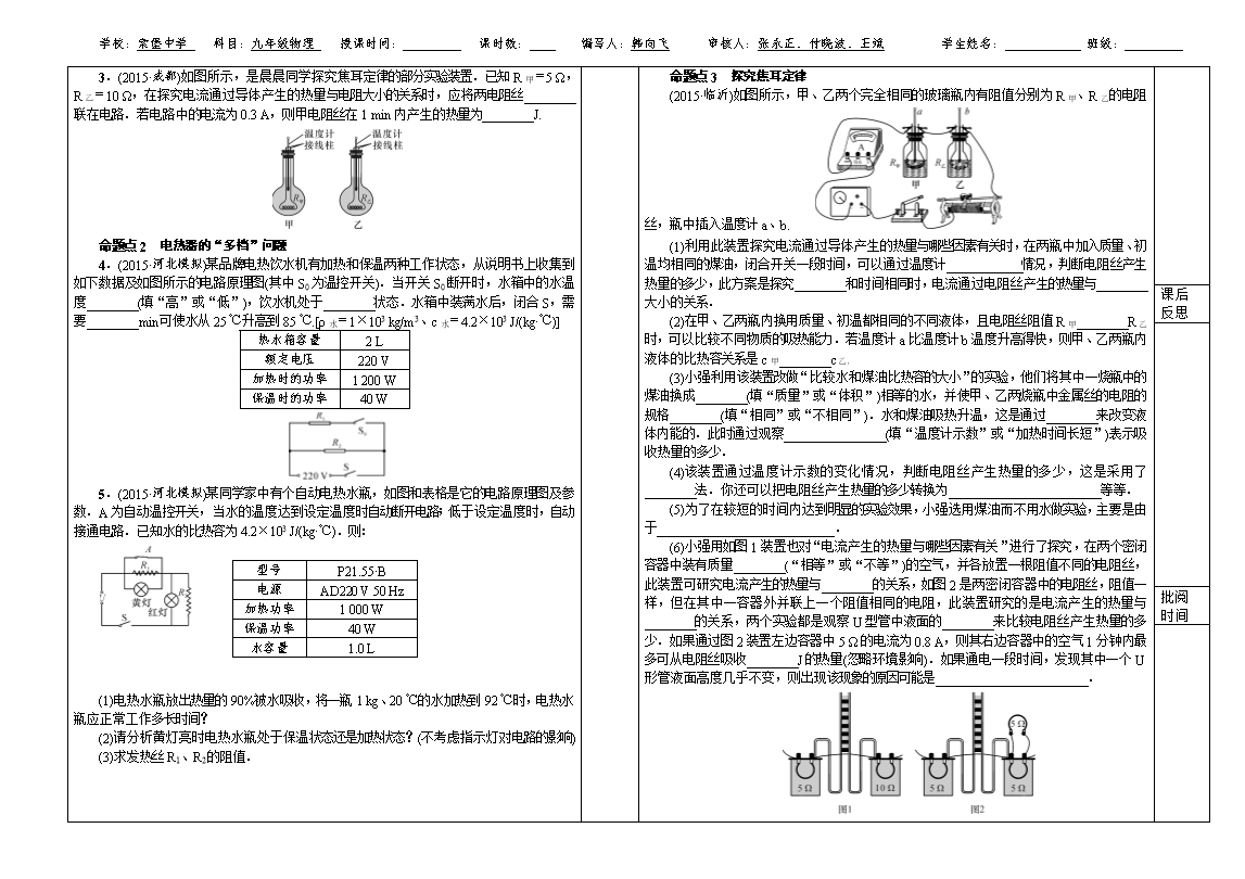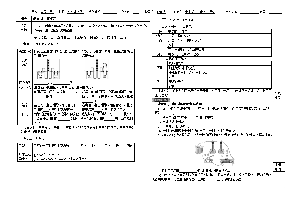 邯郸市涉县索堡中学2015-2016学年中考一轮复习物理导学案《第19讲 焦耳定律》无答案
