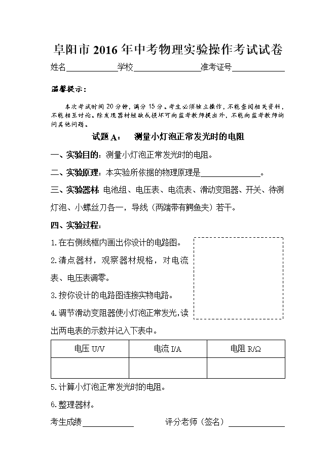 阜阳市2016年中考物理实验操作考试试卷