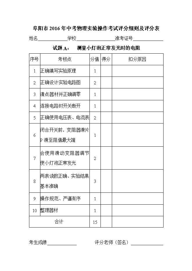 阜阳市2016年中考物理实验操作考试评分细则及评分表
