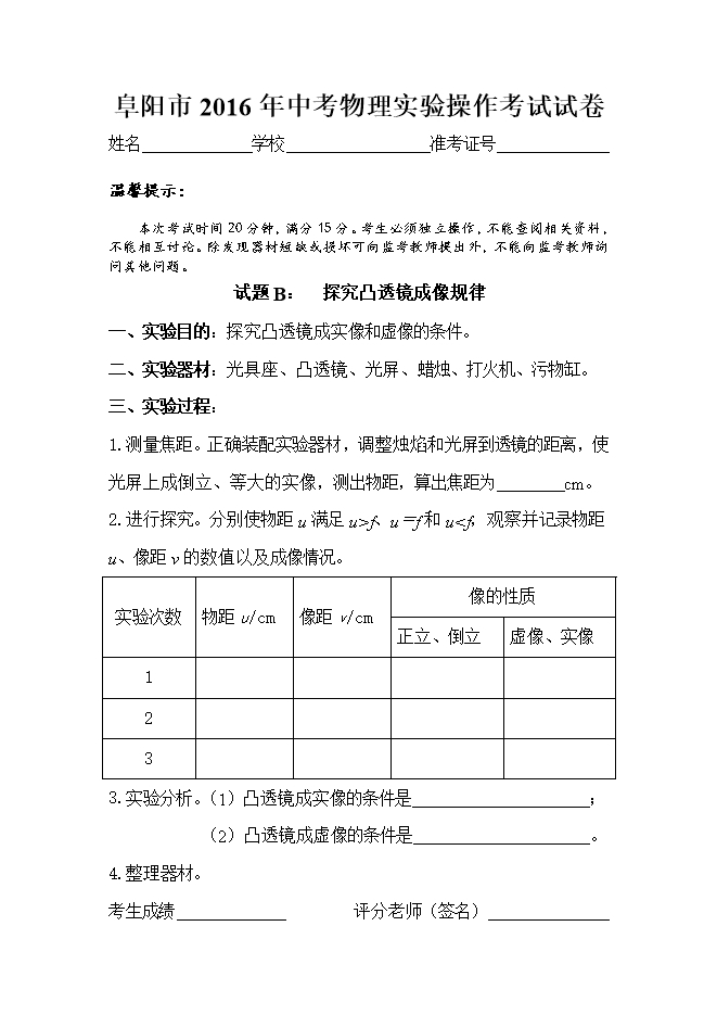 安徽省阜阳市2016年中考物理实验操作考试试题(4套,word版)