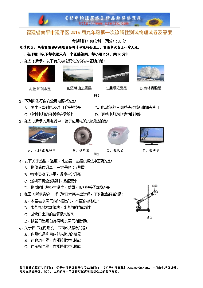 福建省南平市延平区2016届九年级第一次诊断性测试物理试卷及答案