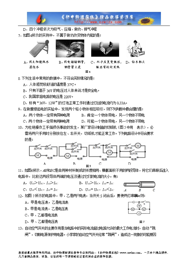 7.如图4所示的实例中,不属于做功改变物体内能的是: