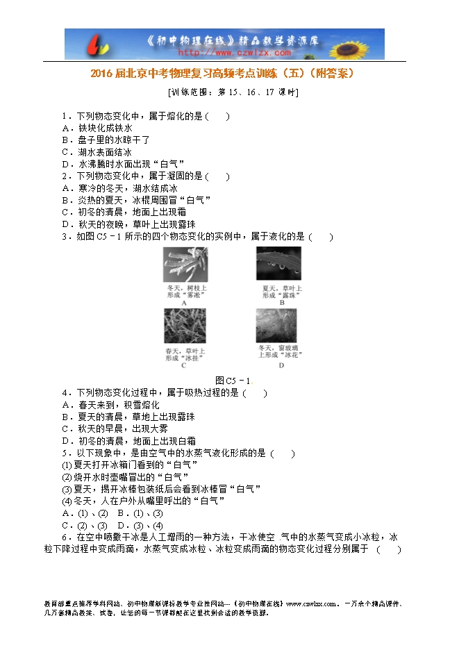 3.如图C5-1所示的四个物态变化的实例中,属于液化的是( )