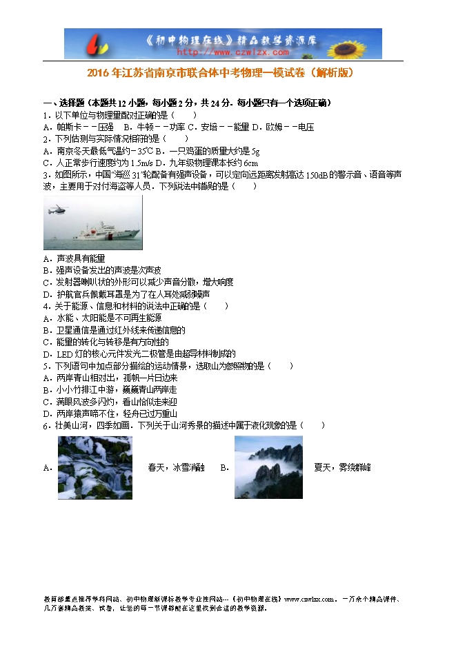 2016年江苏省南京市联合体中考物理一模试卷(解析版)