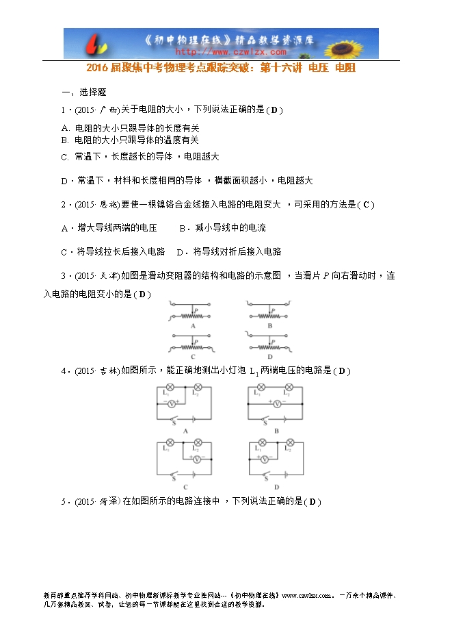 2016届聚焦中考物理考点跟踪突破:第十六讲 电压 电阻