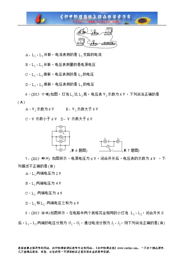 4.(2015?吉林)如图所示,能正确地测出小灯泡L1两端电压的电路是( D )