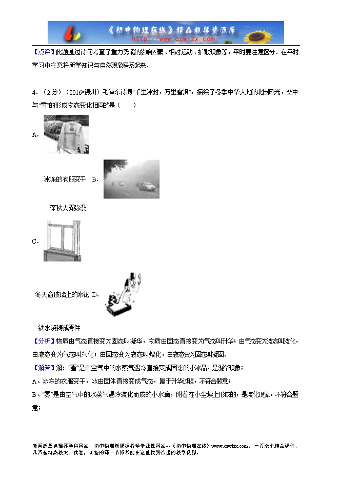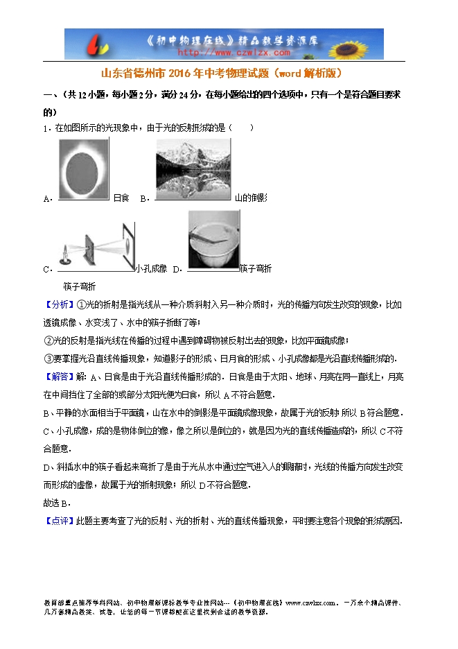【解答】解:A、日食是由于光沿直线传播形成的.日食是由于太阳、地球、月亮在同一直线上,月亮在中间挡住了全部的或部分太阳光便为日食,所以A不符合题意.