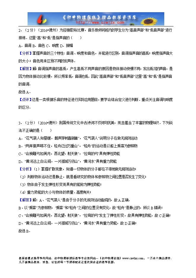 2.(2分)(2016?德州)为迎接歌咏比赛,音乐教师将班内的学生分为“高音声部”和“低音声部”进行排练.这里“高”和“低”是指声音的( )