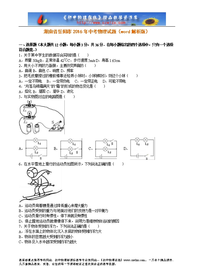 湖南省岳阳市2016年中考物理试题(word解析版)