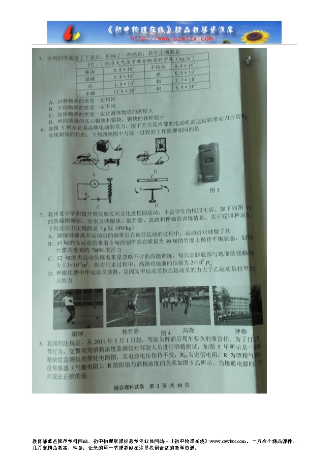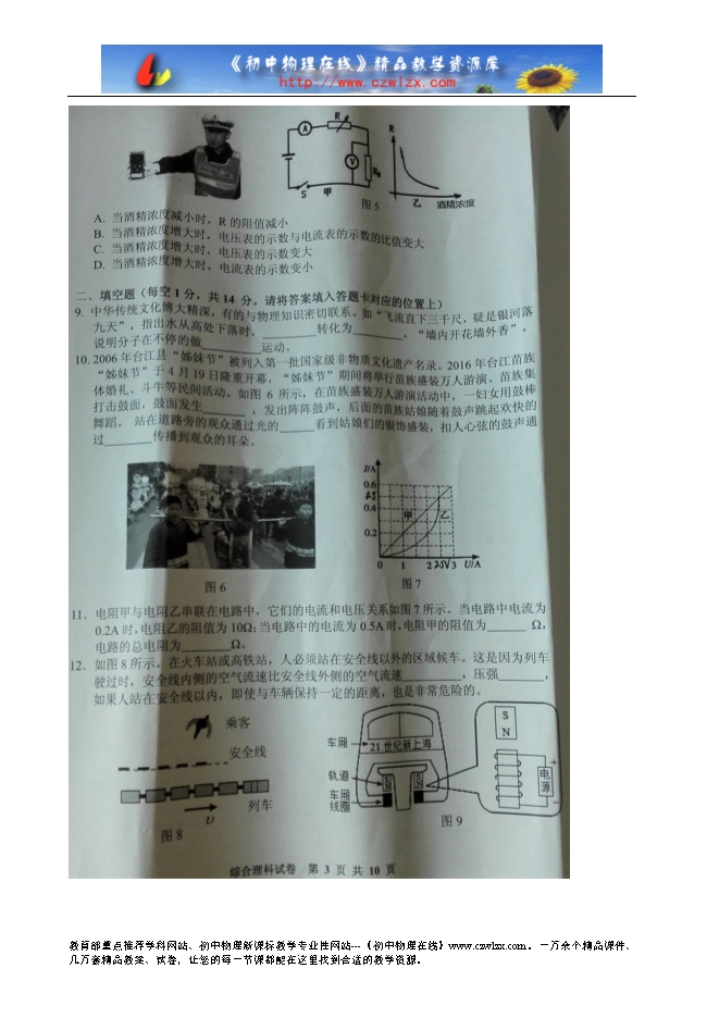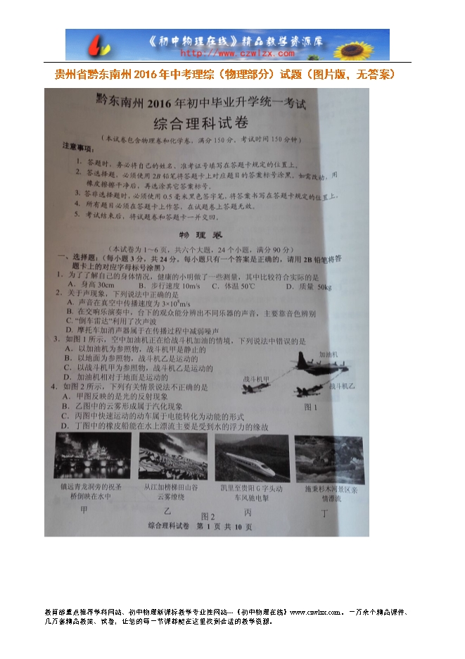 贵州省黔东南州2016年中考理综(物理部分)试题(图片版,无答案)