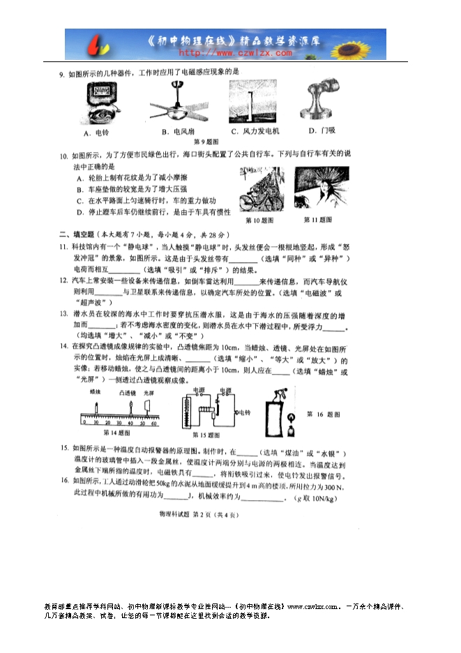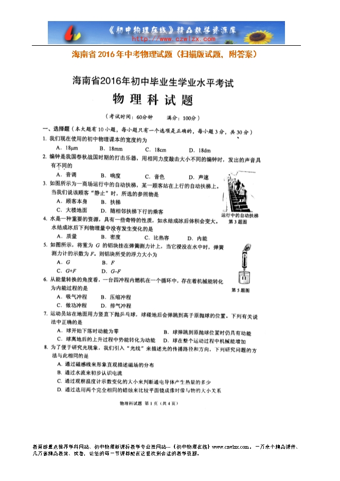 【内容简介】海南省2016年中考物理试题(扫描版试题,附答案)