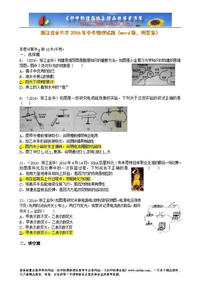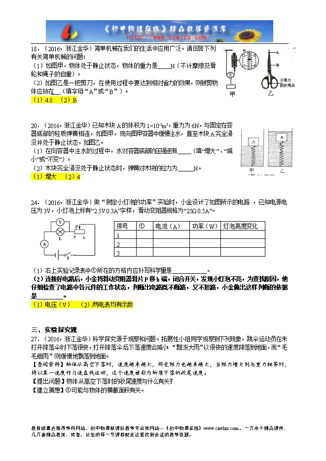 浙江省金华市2016年中考物理试题(word版,附答案)