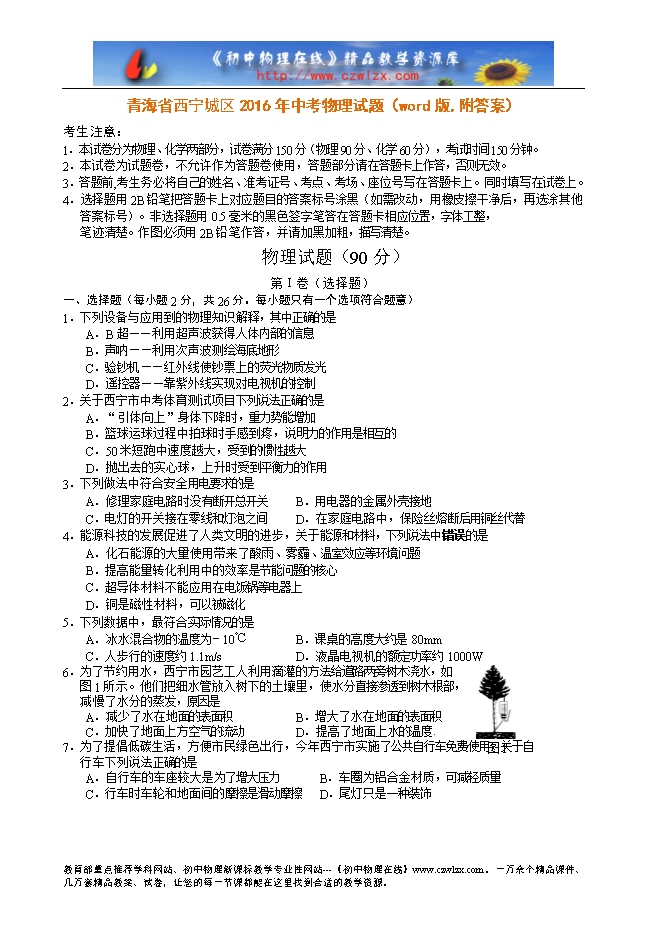 青海省西宁城区2016年中考物理试题(word版,附答案)